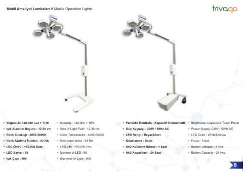 • Yoğunluk: 120.000 Lux + %10 • Intensity : 120.000 + 10% • Parlaklık Kontrolü : Kapasitif Dokunmatik • Brightness: Capacitive Touch Panel